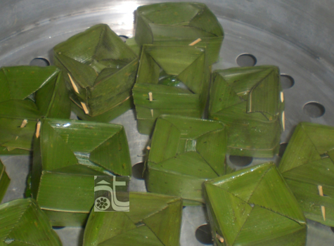 Bánh phu thê (xu xê) ngày xưa được pha màu vàng nhạt, nay mình dùng màu lá dứa, nhớ cho ít màu xanh thôi, khi bánh chín trong suốt, nhìn thấy nhân đậu xanh bên trong đẹp lắm. Cách xếp khuôn thì dùng giấy bạc, nếu siêng thì đi tìm lá diêu bông, lại quên nữa [8D] lá dừa mới đúng, xếp thành hình vuông rồi gài bằng tăm. Mình mà làm bánh bằng lá dừa nhớ lấy tiền công cho cao mới đáng nha.