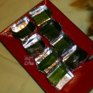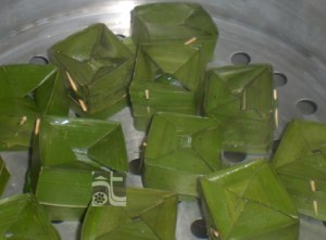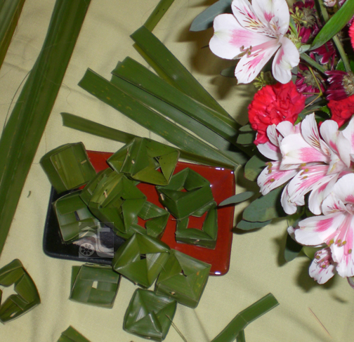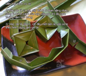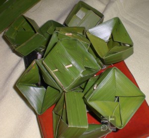 Ở S J không có lá dừa, n đ dùng lá palm – cọ về xé ra làm hộp, loại lá này rất cứng nên bẻ khó và nhất là không có sống lá, nên hộp khó vuông vắn .