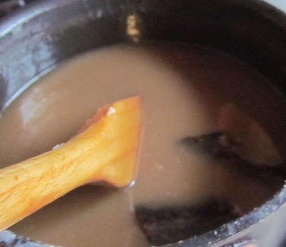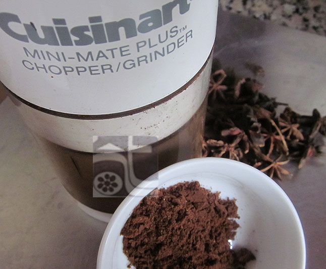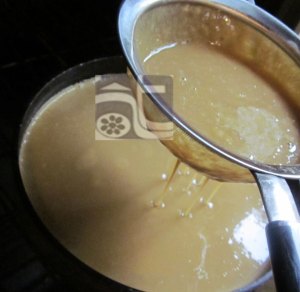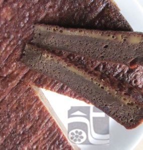 Nấu nước cốt dừa cùng đường thẻ cho tan – nếu dùng chocolate miếng thả vào lúc này – nấu hoa hồi đã rang rồi nếu không có máy xay nhuyễn thành bột như ở trên – đợi đường nguội hãy vớt hoa ra. Trứng đánh tan không cần nổi cao, đổ nước đường đã nguội vào, trộn đều cùng tất cả các nguyên liệu.