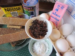 1 hộp cốt dừa – 200 gr đường thẻ -(4 thẻ đường dài) – 10 trứng vịt hay gà to – trứng vịt ngon hơn gà – 8 đến 10 hoa hồi rang vàng xay nhuyễn – nếu không có máy xay cho vào nấu với nước dừa cũng được – chocolate bột 4 muỗng cafe – cà phê đen đậm đặc 4 muỗng nếu muốn – co thể dùng bột cacao cũng được – 1 muỗng canh bột gạo – 2 muỗng cafe bột nổi.