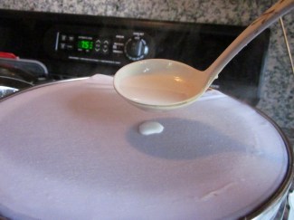 Công thức khuấy bột rất đơn giản – một chén bột cần một chén nước – muốn bánh trong dai thì cho thêm bột năng. Muốn bánh ngon thì bột phải nở đều, khuấy trước vài tiếng cho chút muối – Điểm chính của bôt bánh cuốn là cách pha như sau:
