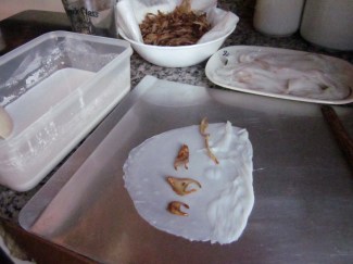 Nhân dùng 200 gr thịt băm – một củ sắn băm – 1/2 chén nấm mèo đã ngâm cắt nhuyễn, xào với dầu đã dùng phi hành, 1 muỗng canh đường – 1/2 muỗng canh nước mắm.