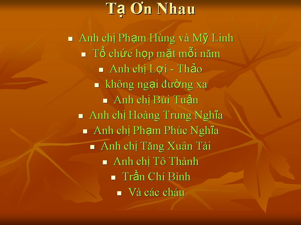 Mỗi năm vào ngày lễ Tạ Ơn, tôi thích nhớ về những ngày vừa bước chân đến Mỹ, mỗi năm trí nhớ đưa tôi về một khung cảnh khác nhau, một vài khuôn mặt khác nhau. Con gà đầu tôi nướng, đến con thứ hai, rồi con thứ ba, thay vì ăn những món thuần Việt Nam, anh bạn đã khuất của chồng tôi, thưở ấy dậy tôi nướng sò – loại sò to thật to khi có tiệc anh mua một bao hai mươi ký, bảo tôi nướng lên ăn với muối tiêu chanh, căn bếp nhỏ xíu nhà tôi lúc ấy cho đến bây giờ cũng vậy, khoảng rộng vừa đủ cho một gia đình năm người, gần hai mươi người căn nhà thành nhỏ xíu, đi qua lại đụng vào nhau. Đọc tiếp “Lễ Tạ Ơn”