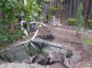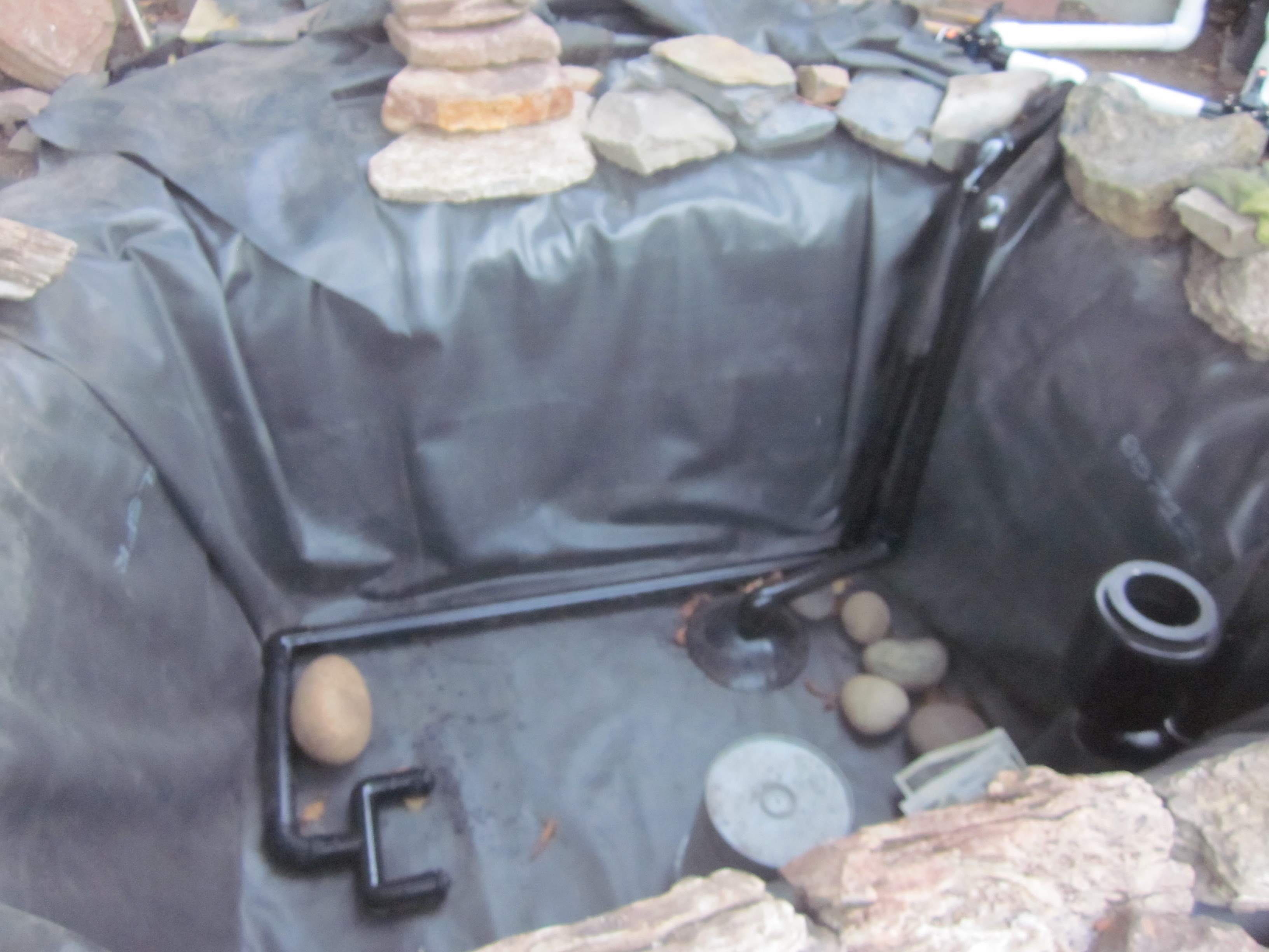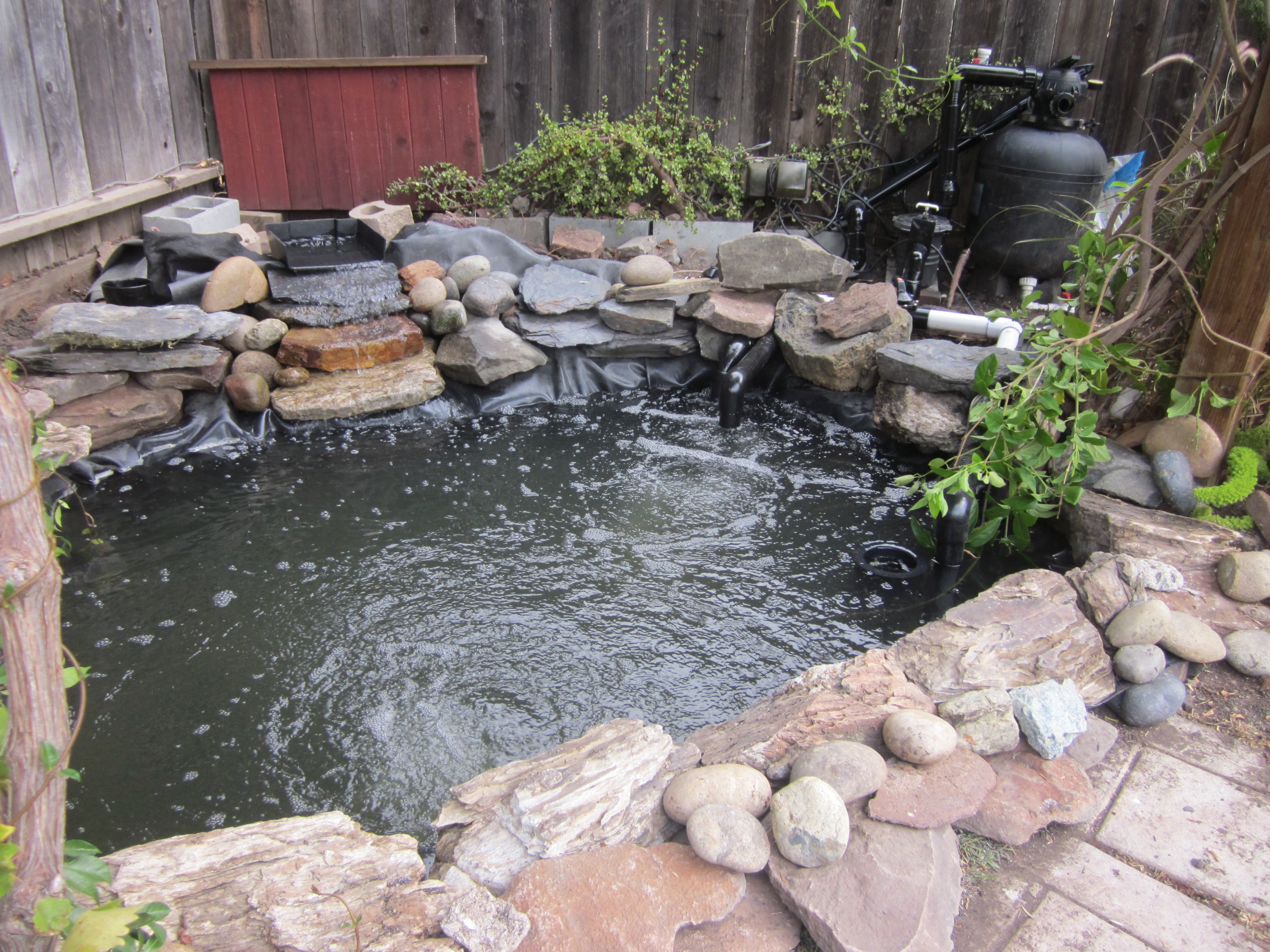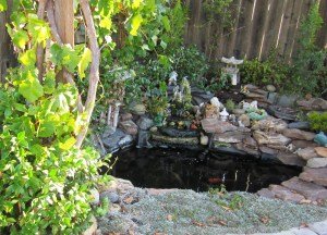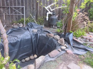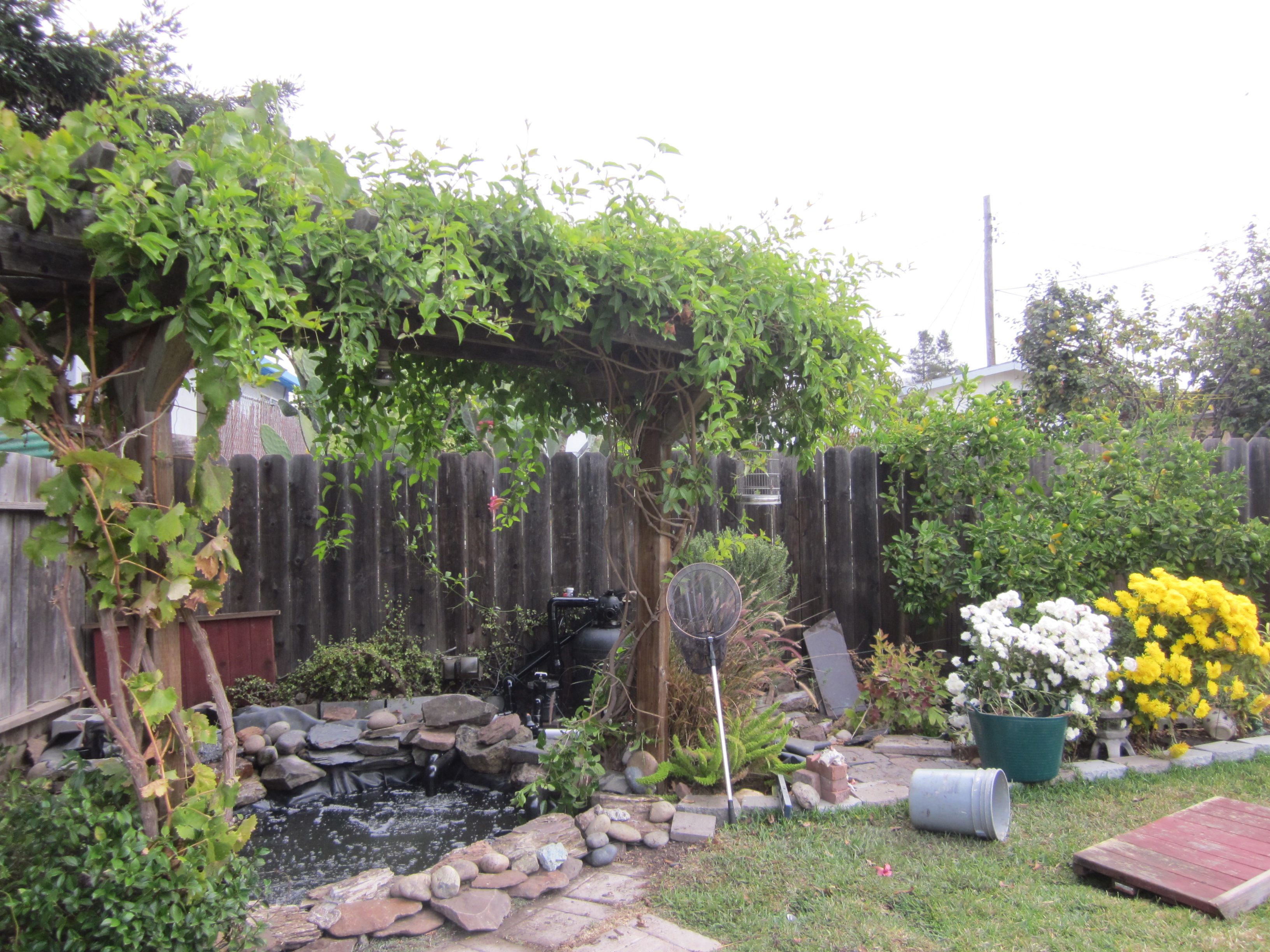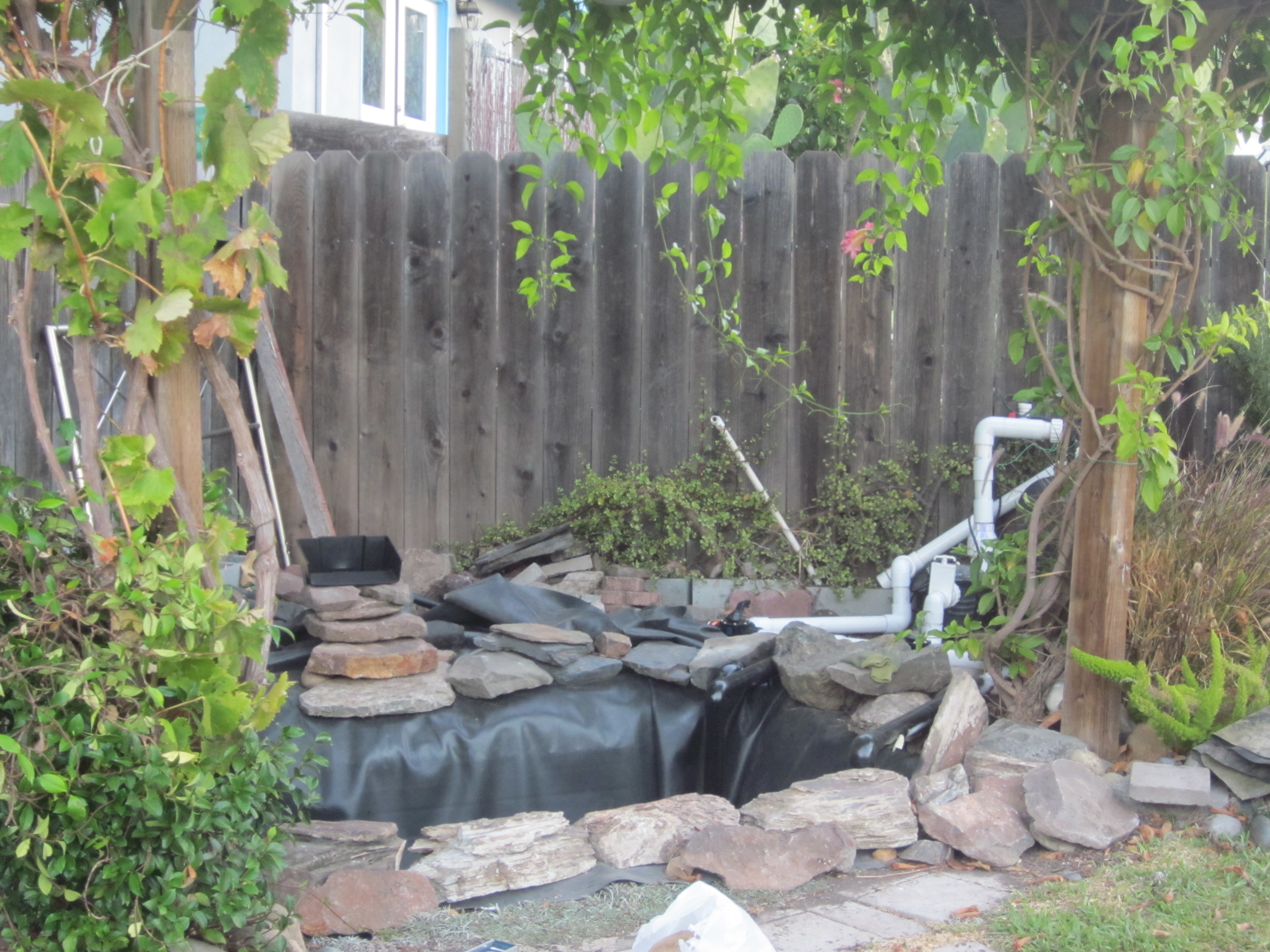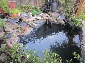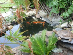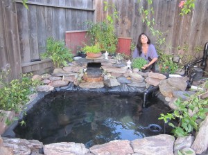 Và tháng 10 năm nay, món quà tôi tự cho tôi là chiếc hồ cá chép tôi sửa lại, làm cho nó to thêm ra. Nhiều người sẽ nghĩ tôi không bình thường, khi tôi chơi với đất và đá. Tôi làm chiếc hồ cá xinh xắn này năm 2005, nhừng chú cá ngày càng lớn, chiếc hồ năm nào thành chật chội. Tự dưng nước hồ bị cạn đột ngột – vội vã mang cá đi gởi – tháo hết nước ra mới hay là: đáy hồ nơi tôi đặt ống hút nước lên bình lọc bị hở, nếu vá víu thì cũng chỉ tạm thời – lỗi nặng nề là tôi đã không đặt ống thẳng góc, tôi đổ xi-măng không phẳng nên ống bị vênh, đã thế tôi lại hay leo xuống hồ để rửa rong, sức nặng của tôi đạp vào lớp cao su lót hồ làm nó bị giãn ra. Lần này tôi làm cho hồ lớn rộng thêm, thay vì đặt ống hút bên dưới lớp cao su bottom drain, tôi đặt ống hút nằm trên bottom vaccum