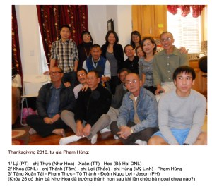 Mỗi mùa lễ Tạ Ơn, chúng tôi họp cùng nhau bên món ăn truyền thống, gà tây, bánh táo, bánh bí đỏ, khoai lang, lần này chúng tôi vắng Chị, nỗi buồn không thấy chị chẳng to lớn bằng nỗi buồn, chị chưa hưởng được an nhàn đã vội ra đi. Thứ sáu, sau ngày lễ Tạ Ơn 2012, gia đình Khóa 26 Bắc California sẽ tiễn đưa chị về chốn hư vô – hình ảnh hiền hòa của chị, nụ cười e ấp của chị còn mãi trong không gian này, nơi chị đã có.