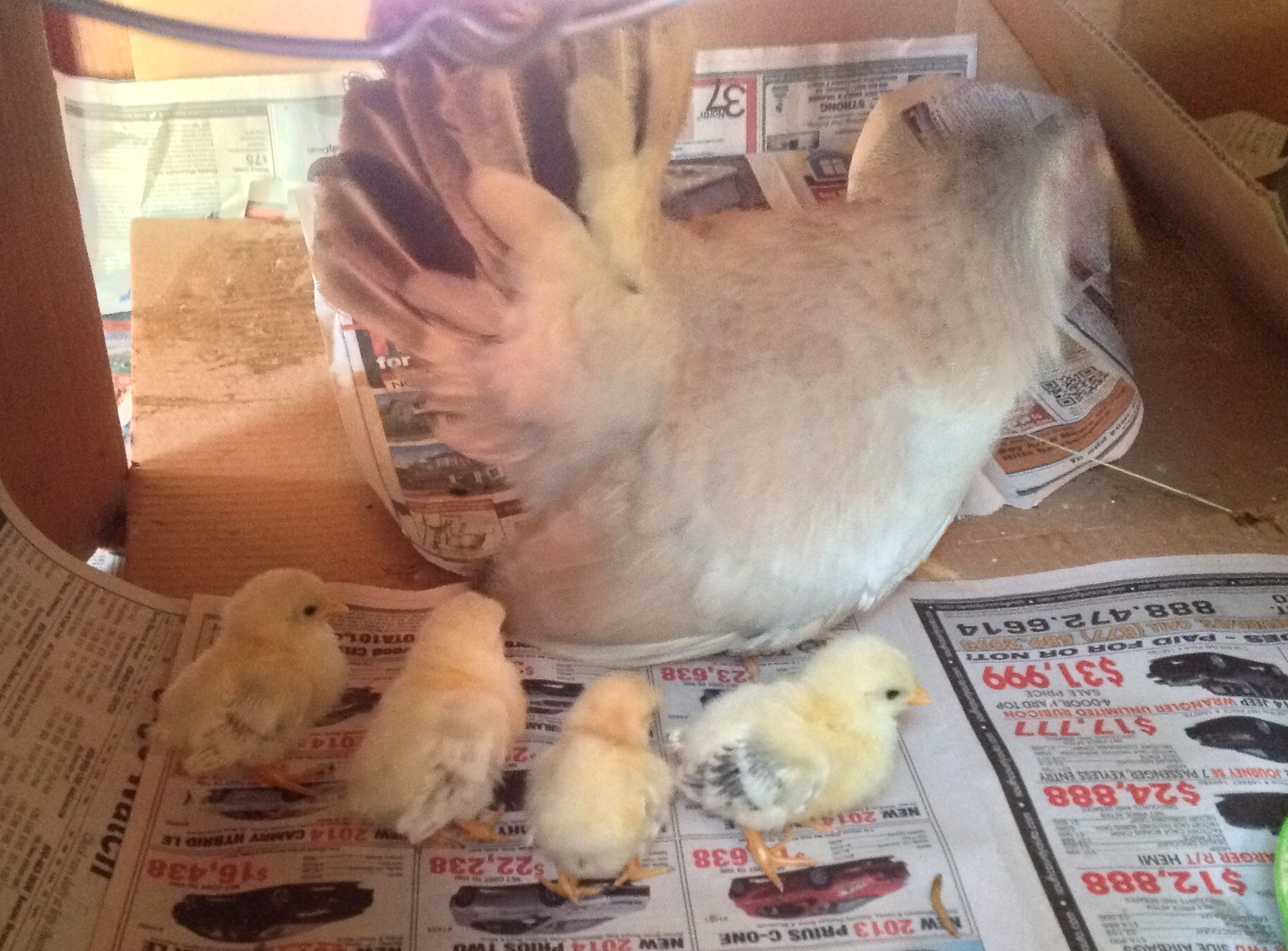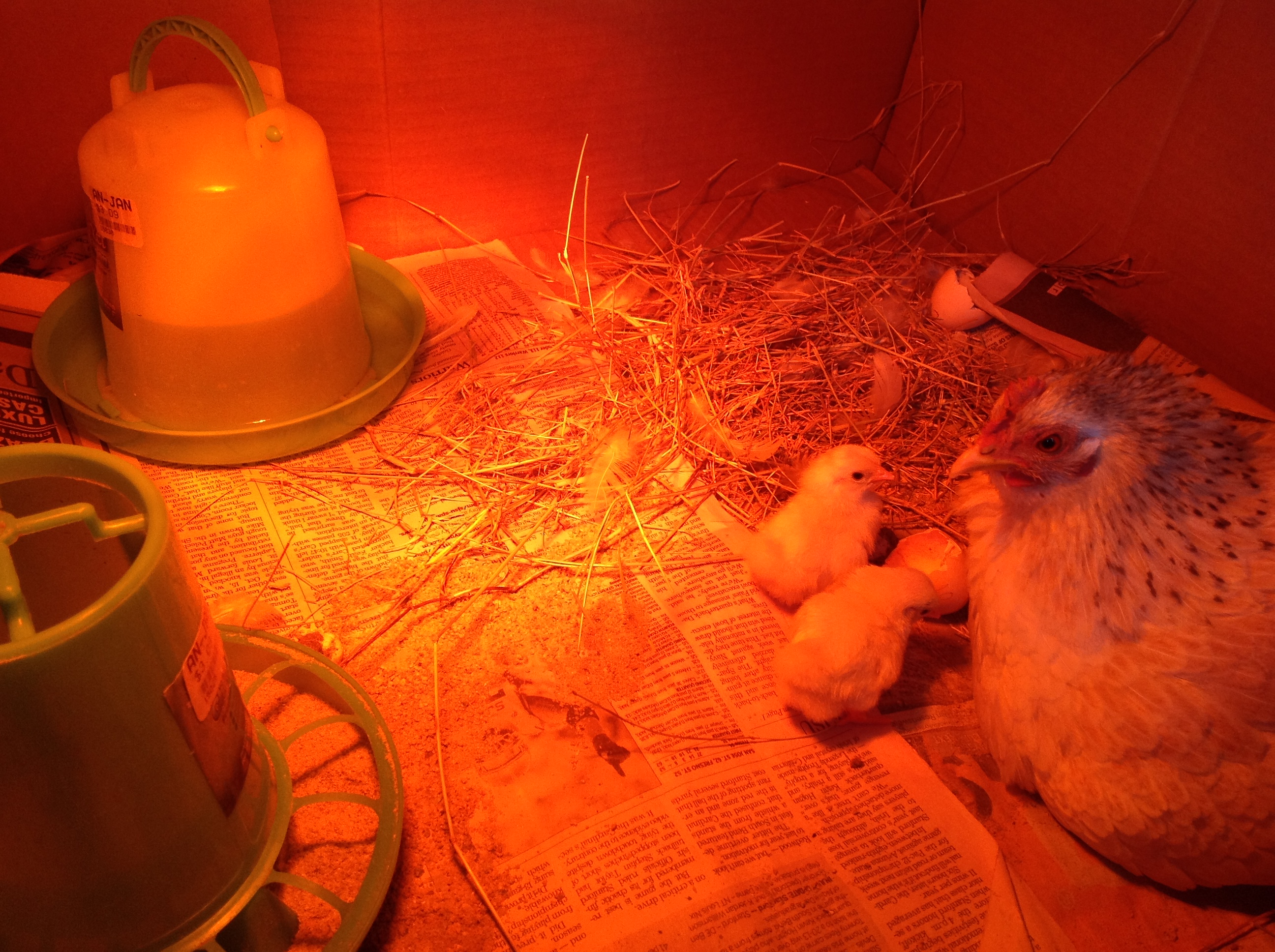 Sáng nay bài tập nhẹ đã xong, người ấm vừa đủ để ra sân thăm bốn chú gà con vừa nở ngày 1 tháng 12, vừa nở xong đã phải chống chọi với cơn lạnh đột ngột, tối qua nhiệt độ xuống 29 độ F = – 1 độ C .