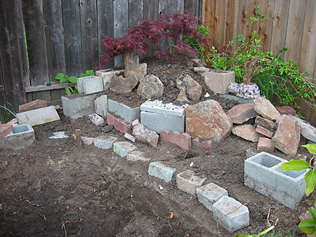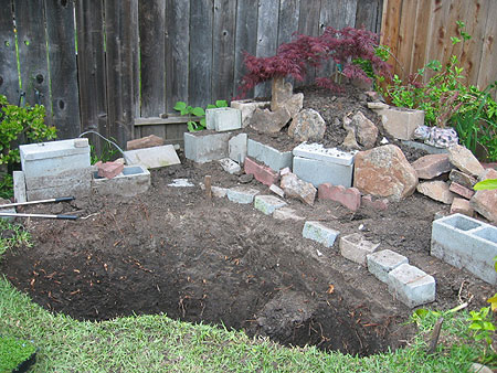 Đi làm về mệt, N Đ chỉ cuốc chừng hai thùng đất, xếp vài cục gạch, xem nên đặt cây nào ở đâu v.v. có gì phải gấp đâu. Khi nào xong thì N Đ nói cho nghe – LT đếm giúp N Đ há. N Đ bắt đầu đào đất ngày thứ năm 20 tháng 4 đào xong vào ngày Đất (Earth day) – 22 tháng 4 Tuần đó N Đ không đi làm nên quyết định phá. Khởi đầu N Đ cuốc một mình, mệt quá gặp ngay anh chàng hàng xóm tốt bụng người Mễ anh ta nói để anh ấy đào giúp cho. N Đ đề nghị là cho N Đ gởi tiền vì nếu N Đ ra home depot tìm một anh Mễ về đào giùm cũng phải trả 80 đồng một ngày, N Đ không muốn mang người lạ vào nhà. Anh ta nói không cần chỉ giúp cho vui – N Đ không chịu sau cùng anh ta nói OK lấy tiền uống bia. Chỉ cần hơn 4 tiếng là xong, anh ta hất đất lên bờ, N Đ đem đi đổ. Cuối tuần này N Đ nhất định xong cái viền chung quanh. Khi đã xong N Đ sẽ bắt đầu đặt ống nuớc, đặt nền, gắn bơm, bình lọc và…..xong á.