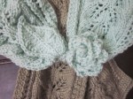 Cái khăn quàng có đuôi như chiếc lá , màu trắng nằm trên nền áo vàng , đẹp quá . Móc có khó lắm không ?Thấy hình chị mê quá . Món nầy gọn , vừa phải mà rất trang nhã . Chị thích lắm.